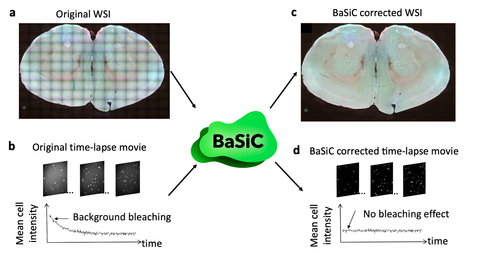 BaSiC is a software tool for Background and Shading correction of Optical Microscopy Images. It implements an image correction method based on low-rank and sparse decomposition to solve both shading in space and background variation in time. It can correct temporal drift in time-lapse microscopy data and thus improve continuous single-cell quantification. BaSiC is available as a Fiji/ImageJ plugin.