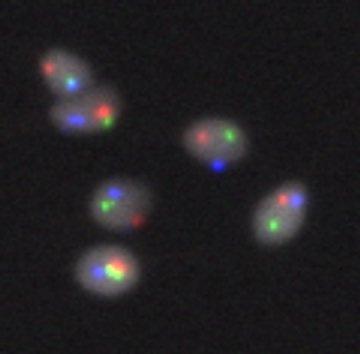 The macro segments and classifies human spermatozoids nuclei (DAPI) based on the number of FISH signals (spots) they contain. It reports the percentage of occurrences of user defined classes (combinations of spot multiplicity in the FISH channels) as well as the position (point selections) of the detected nuclei falling in these classes. The input image should be an hyperstack with 4 channels: DAPI (first channel) and three FISH channels. The images are typically obtained as a maximum intensity projection of few channels (confocal) or a single z slice acquisition (widefield).