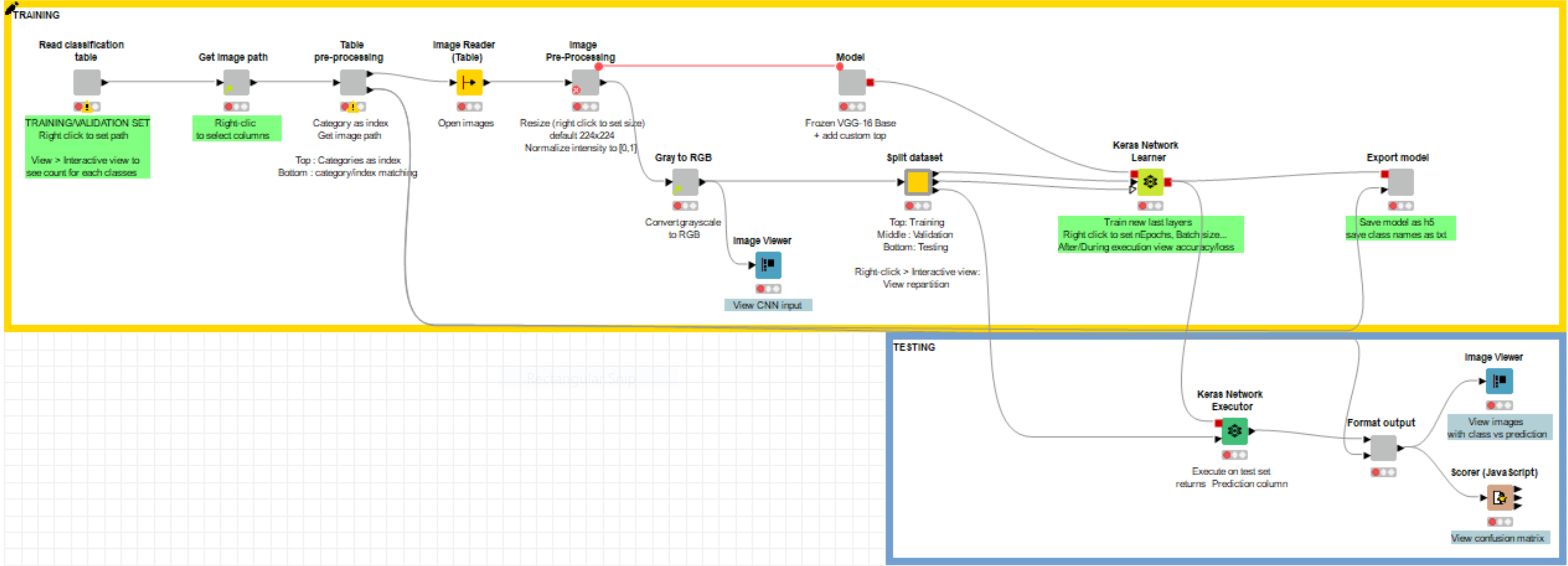 Workflows for the training of a model AND for the prediction of image-category for new images are provided.