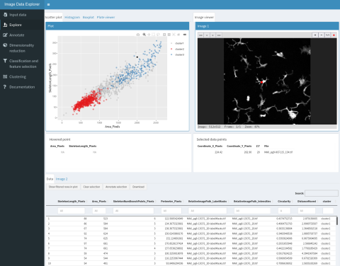 The Image Data Explorer is a Shiny app that allows the interactive visualization of images and ROIs associated with data points shown in a scatter plot. It is useful for exploring the relationships between images/ROIs and associated data represented in tabular format. Additional functionalities include data annotation, dimensionality reduction and classification and feature selection.