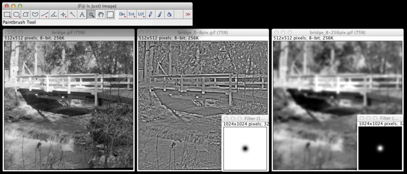 The Fourier transform of an image produces a representation in frequency space: i.e. separated according to spatial frequency (effectively scale). The 2D amplitude map of the different spatial frequencies is symmetrical, and is commonly displayed with low spatial frequencies (large features) in the centre, highest spatial frequencies (small features) at the edges. Fourier filtering involves suppressing or enhancing features in the Fourier domain before carrying out an inverse Fourier transform to obtain a filtered real-space image. ImageJ's _Process > FFT > Bandpass Filter_ implements two common Fourier-filtering functions: 1. filtering for specific sizes of feature in an image by selecting minimum and maximum feature sizes (selecting a radial band of frequencies in Fourier space); 2. filtering out repetitive horizontal or vertical stripes by cutting out a zero-frequency stripe in the orthogonal direction in frequency space. The example image above shows the effect of filtering for 2 feature size ranges: 0-8 pixels, and 8-256 pixels; where the former appears "flattened" or washed-out, and the latter very blurred. The small images displayed to the lower-right of each filtered image correspond to the mask applied to the Fourier transform. Such filtering can be useful prior to global thresholding, for noise suppression, etc.