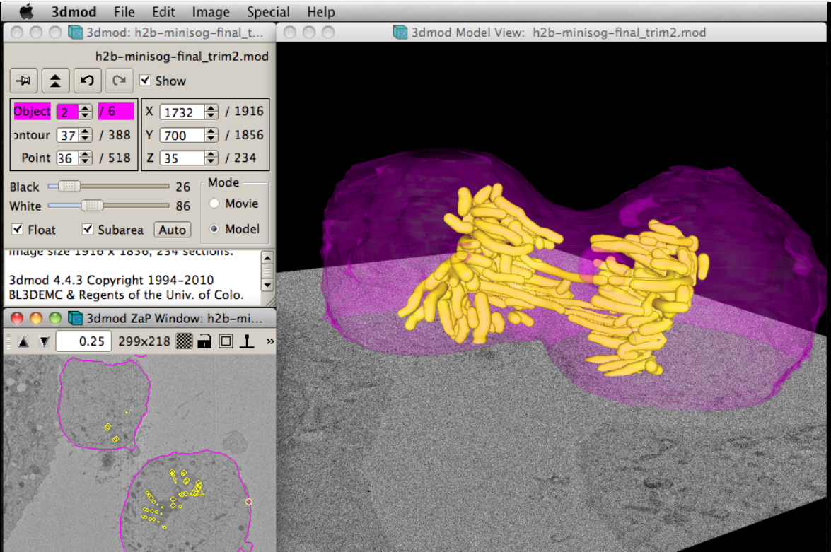 IMOD is a set of image processing, modeling and display programs used for tomographic reconstruction and for 3D reconstruction of EM serial sections and optical sections. The package contains tools for assembling and aligning data within multiple types and sizes of image stacks, viewing 3-D data from any orientation, and modeling and display of the image files.
