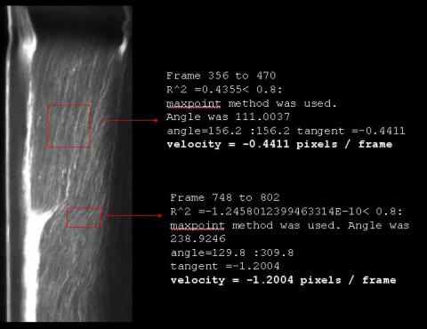 Measurement of kymograph generally deals with slanted streaks in kymograph to measure velocity of movements. This is a pretty much manual procedure that needs hands-on work. Kymoquant analyzes kymograph by treating patterns appearing in kymograph as texture: for a specified area in kymograph, it detects the most likely orientation of streaks and outputs this result as velocity. This workflow was created to ease the situation when it is difficult to find major direction of streaks only with eyes.