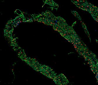 Immunofluorescent sections were imaged on a Nikon AR1 confocal or Nikon Widefield CCD Microscope. Each confocal image is a composite of maximum projections, derived from stacks of optical sections.