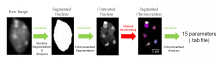 Starting from image stacks, the nuclear boundary as well as nuclear bodies are segmented. As output, NucleusJ automatically measures 15 parameters quantifying shape and size of nuclei as well as intra-nuclear objects and the positioning of the objects within the nuclear volume.