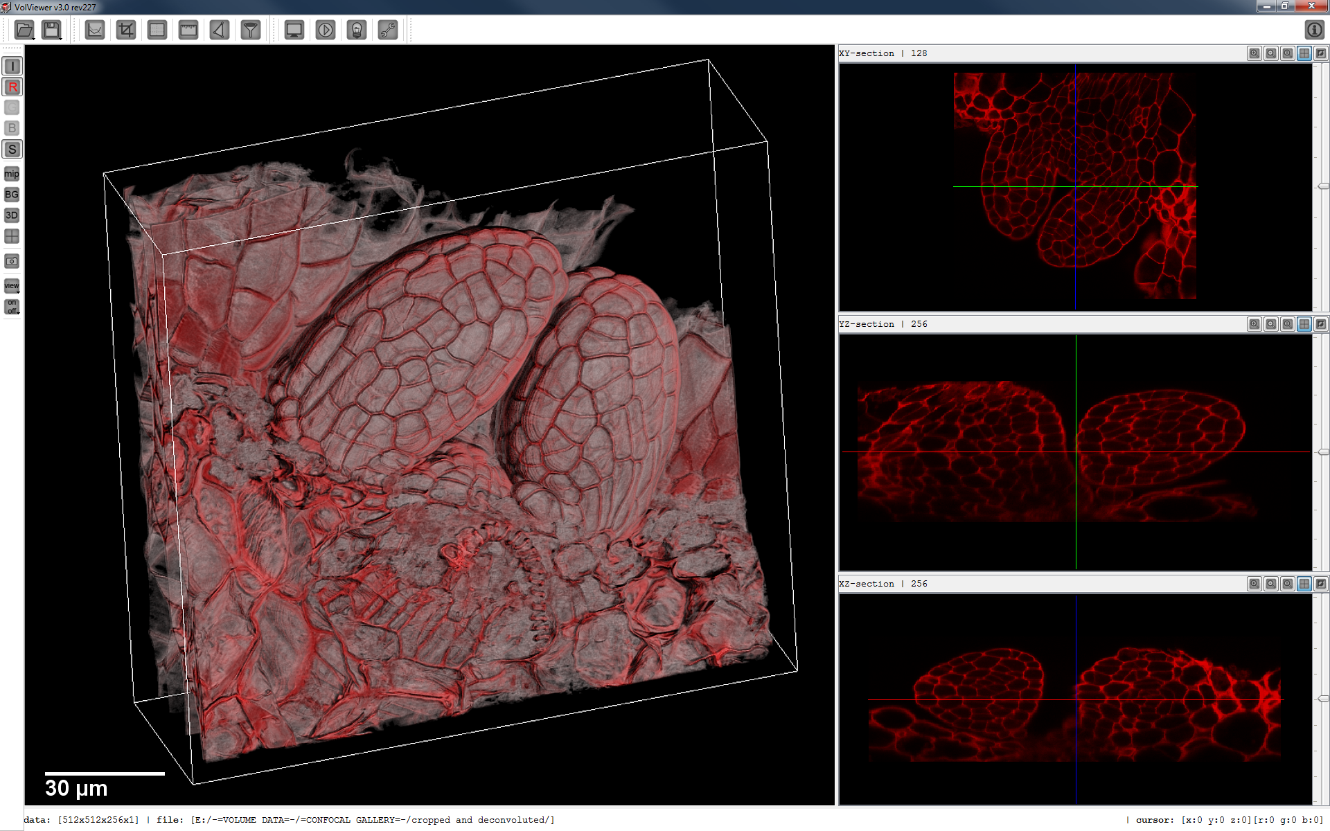 # Summary VolViewer is used for viewing volume images from, for example, confocal microscopy or optical projection tomography # Features * Real-time volume rendering using an optimized 3D texture slicing algorithm. * Interactive transfer functions to independently adjust opacity and intensity for up to three data channels. * Real-time per channel thresholding, brightness and contrast operators. * On-the-fly gradient computation for local illumination. * Iso-surface computation with surface smoothing. * Section viewing in any orientation / position. * Real-time volume clipping. * 3D measurements, filters & segmentation. * Key frame interpolation for movie export. * Stereo rendering using either quad buffer or anaglyph mode. * Scripting interface to other systems, e.g. Matlab, OMERO, etc. # Project Status * Not supported anymore # Source code * [Source code](https://github.com/ut666/VolViewer "GitHub repository")